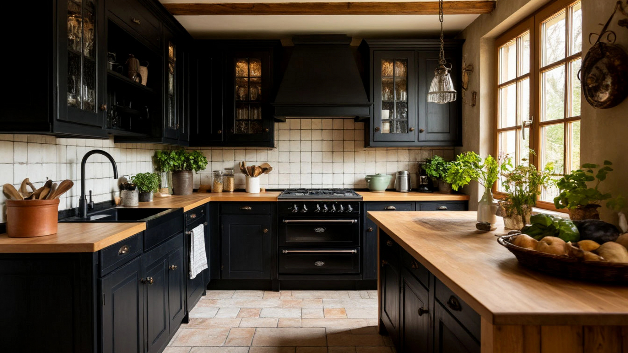 Дизайн кухни подчёркивает тонкую грань между строгостью и уютом. Черный цвет фасадов придает интерьеру солидность, а винтажные элементы, светлая столешница и декоративная фурнитура добавляют мягкости и теплоты. Контрасты и гармоничное сочетание текстур создают впечатление кухни, которая одновременно современна и наполнена духом прошлого. Такой интерьер способен создать атмосферу спокойствия и вдохновения, где хочется проводить время, готовя и общаясь с близкими.