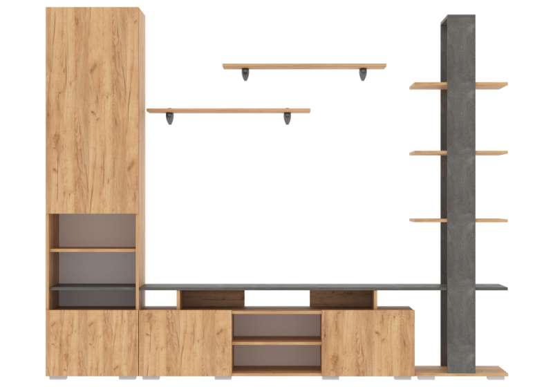 Эта стенка сочетает в себе современный дизайн и практичность. Часть стенки выполнена в красивом оттенке дуба золотого, который добавляет теплоты и света в интерьер, а другая часть в темном камне создает контраст и придаёт массивности. Открытые полки идеально подойдут для размещения книг, декоративных элементов или семейных фотографий, а закрытые шкафчики помогут скрыть лишние вещи и поддерживать порядок.
